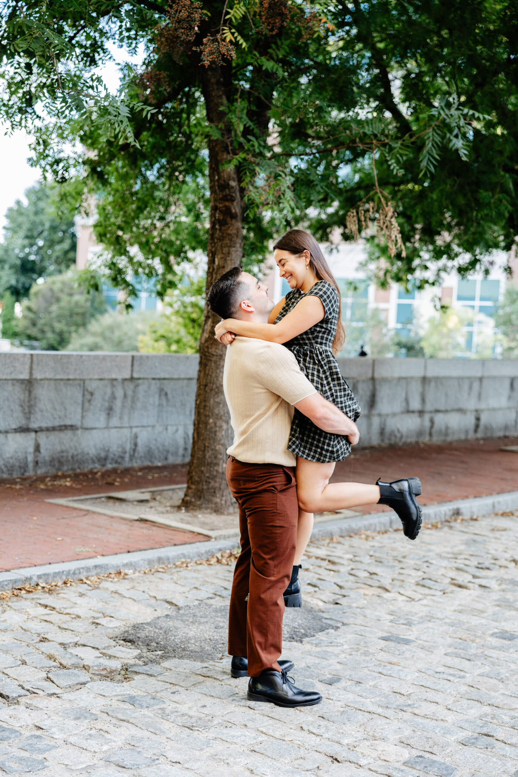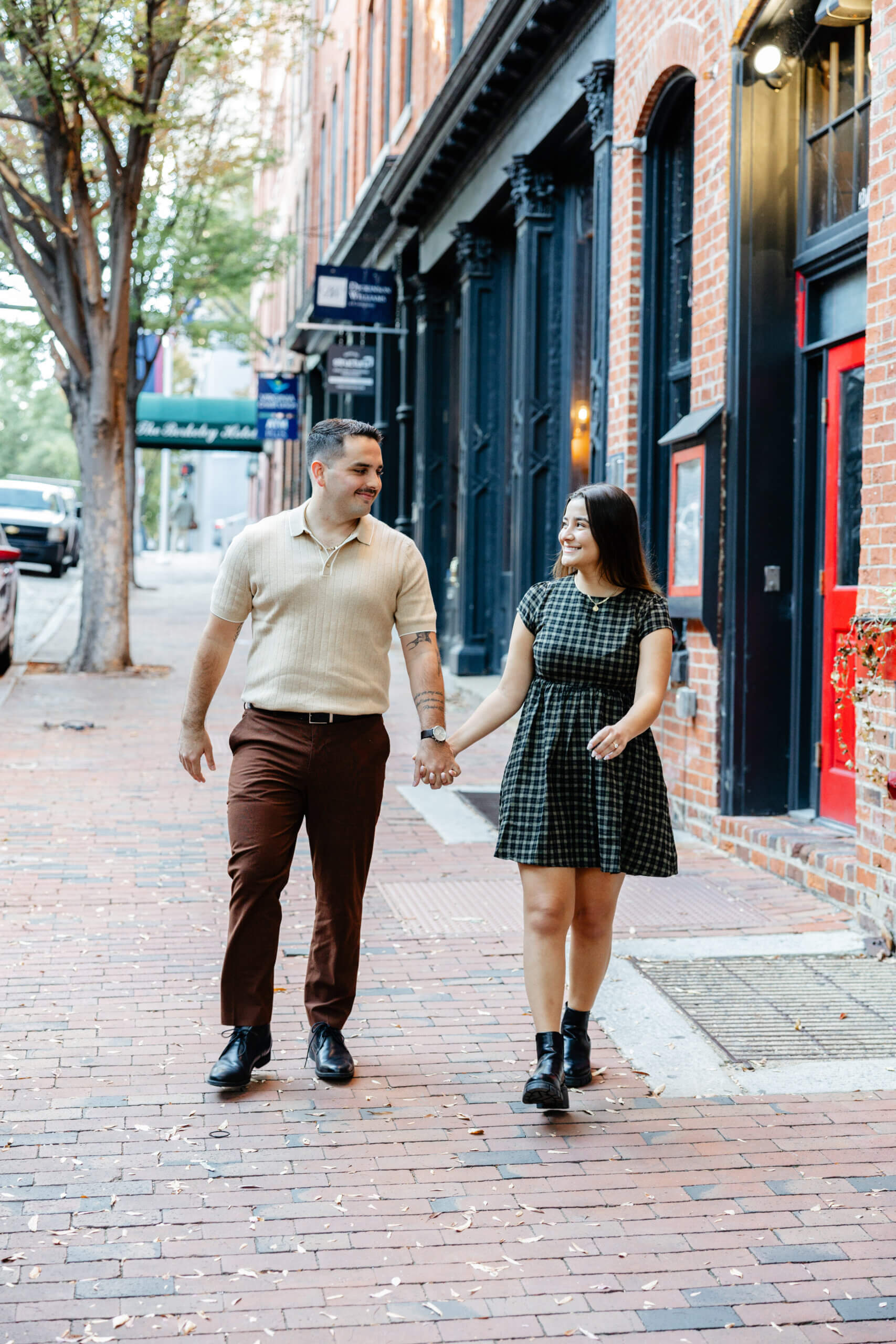 Shockhoe Bottom October Engagement Photography gives us so many backgrounds in just a short walk. We can move from brick walls to open streets to leafy spots without breaking the flow. Additionally, the soft evening light hits the buildings in a way that creates depth and warmth in every frame!