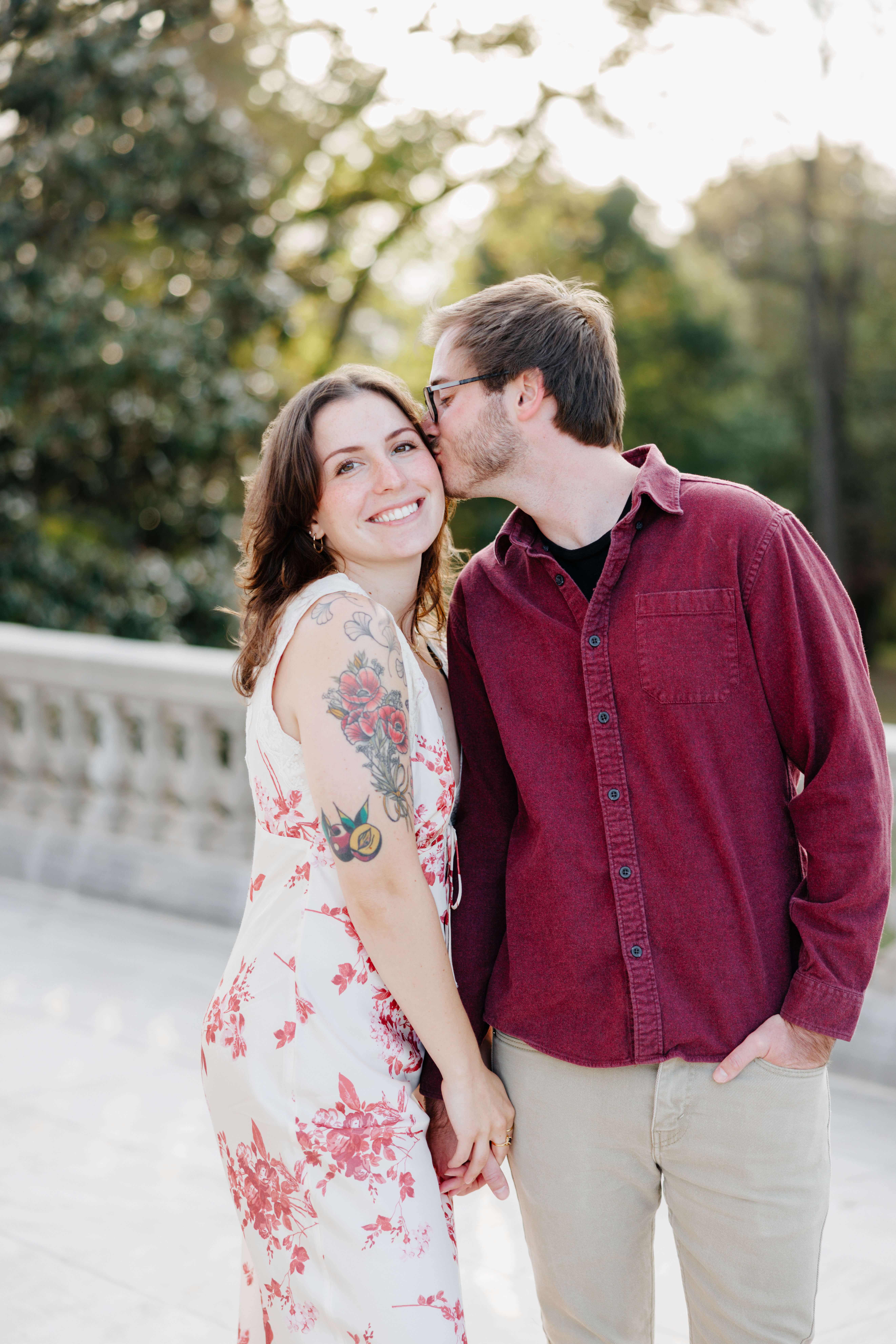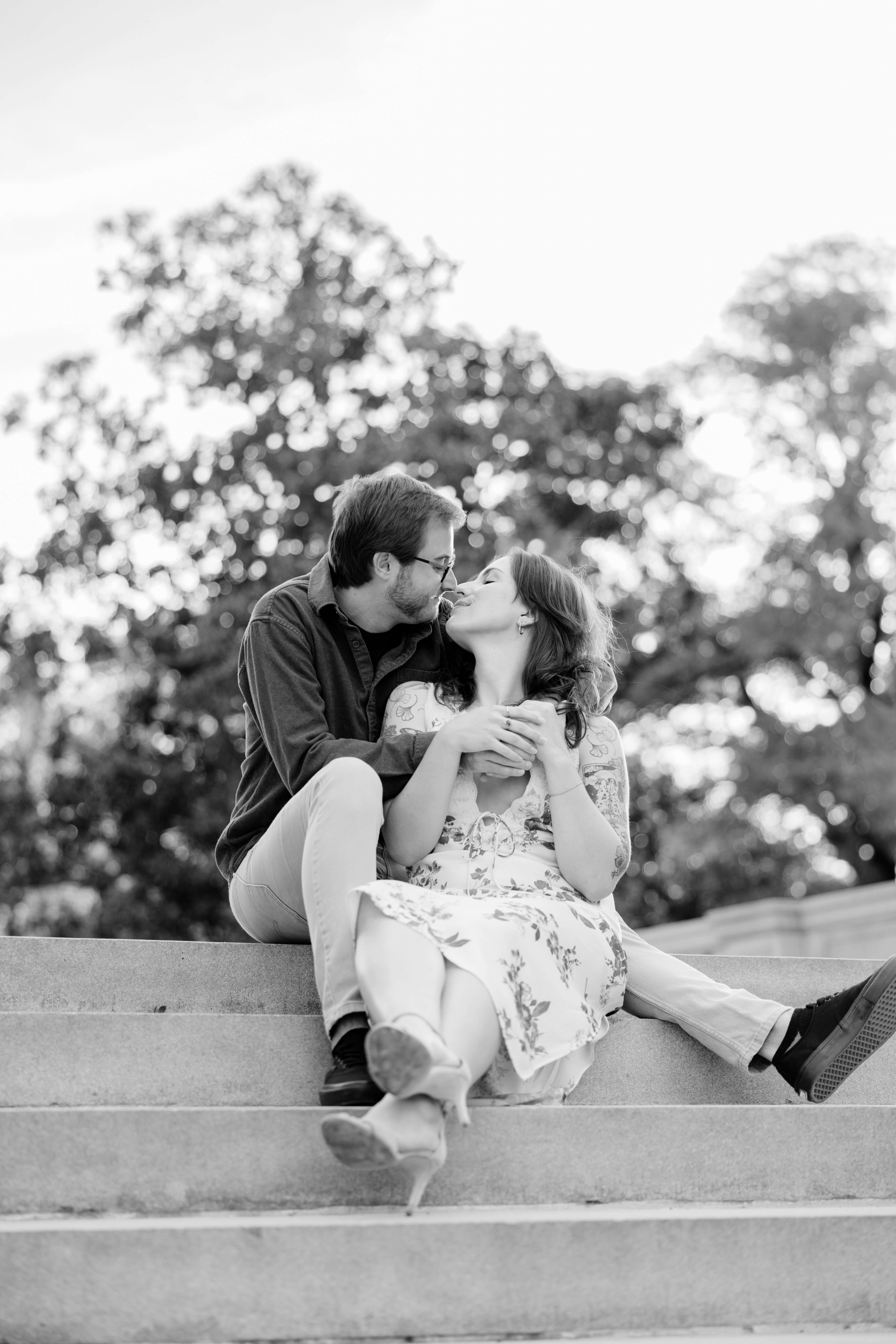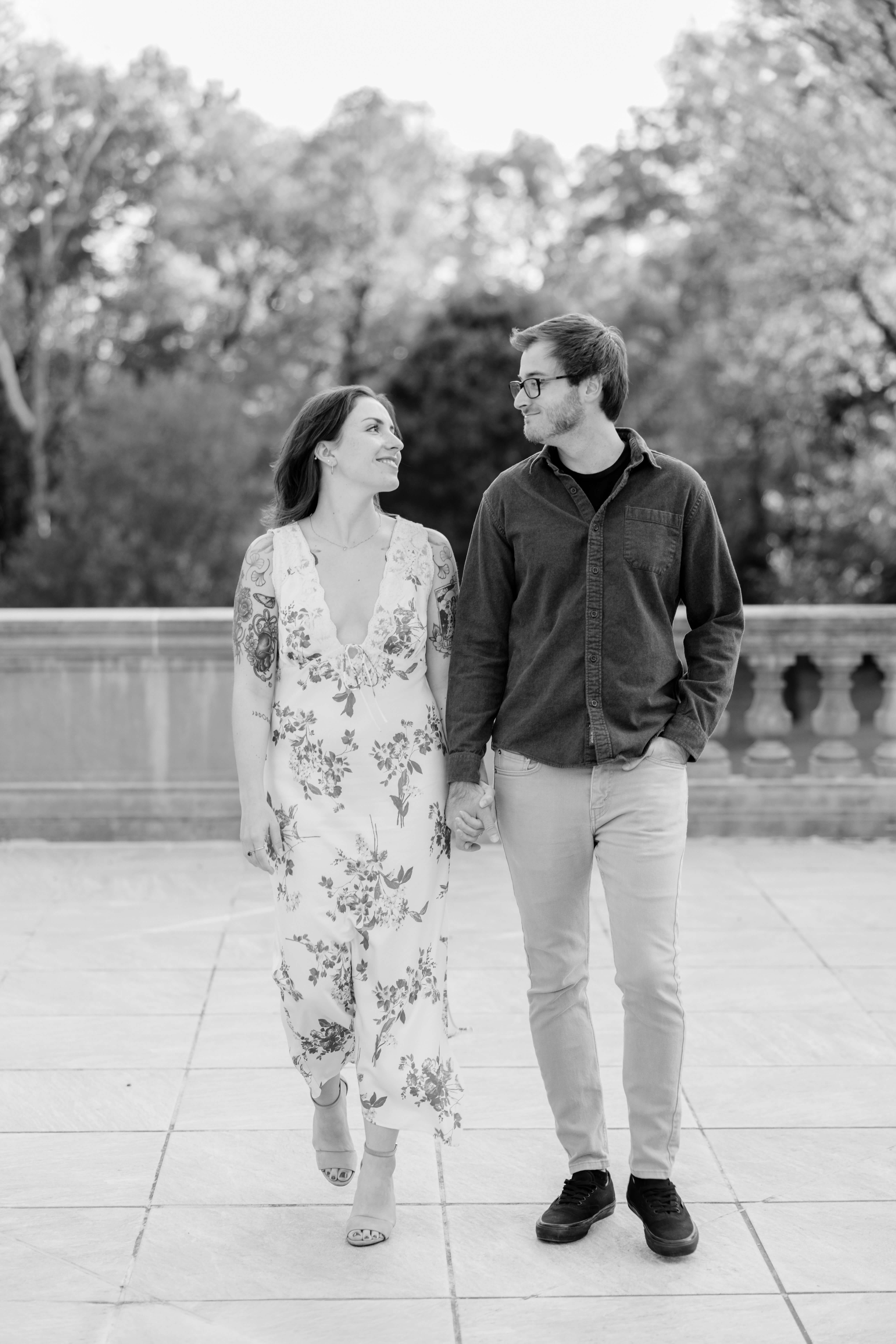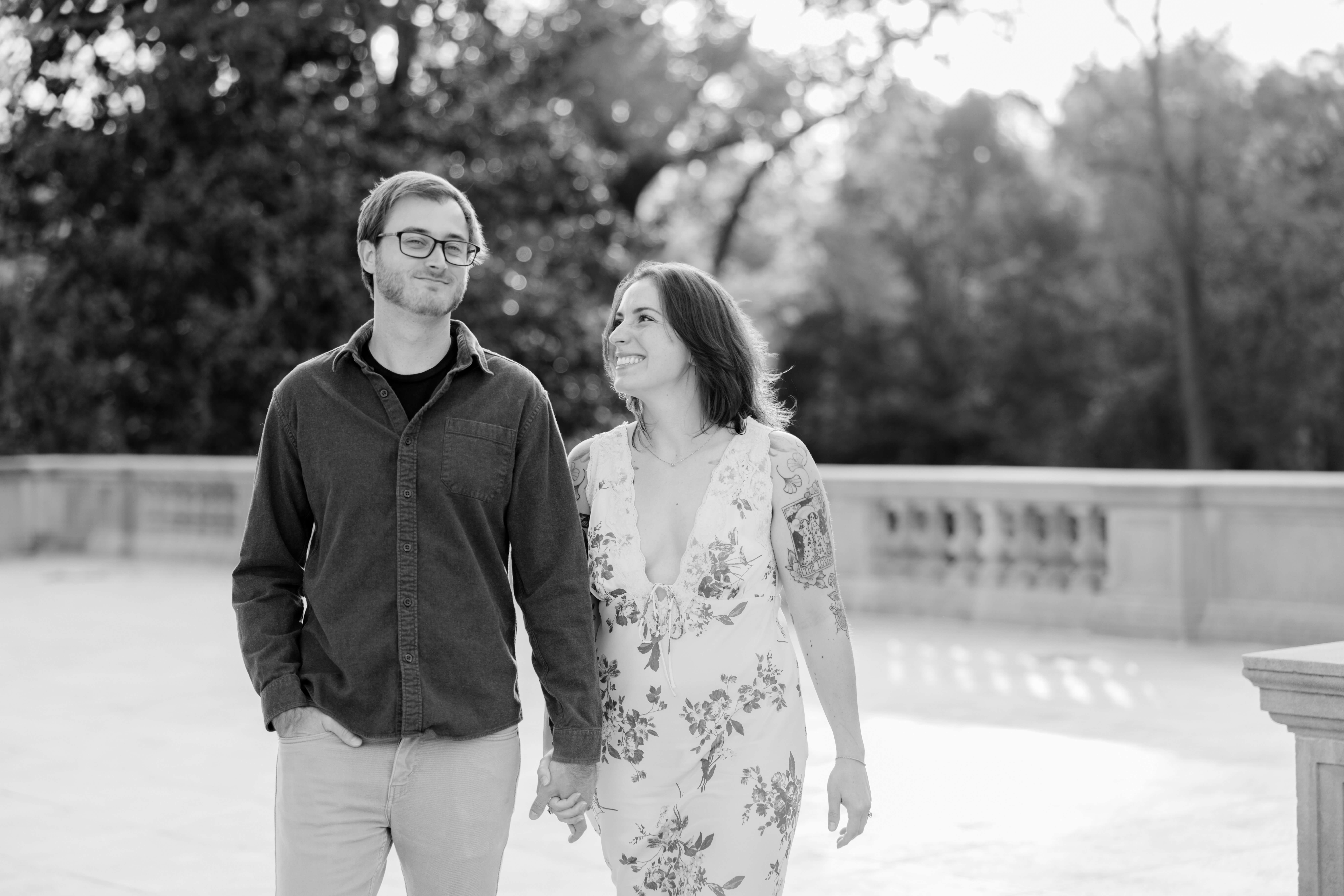 The Carillon is one of our favorite spots for Richmond engagement photography. Because of its tall stone structure and open park views, it gives us variety without ever feeling busy or distracting. We can shoot wide with the tower anchoring the frame, then step into tree-lined paths for something softer and more intimate. As a Virginia engagement photographer, we look for locations that offer depth, texture, and movement all in one place.