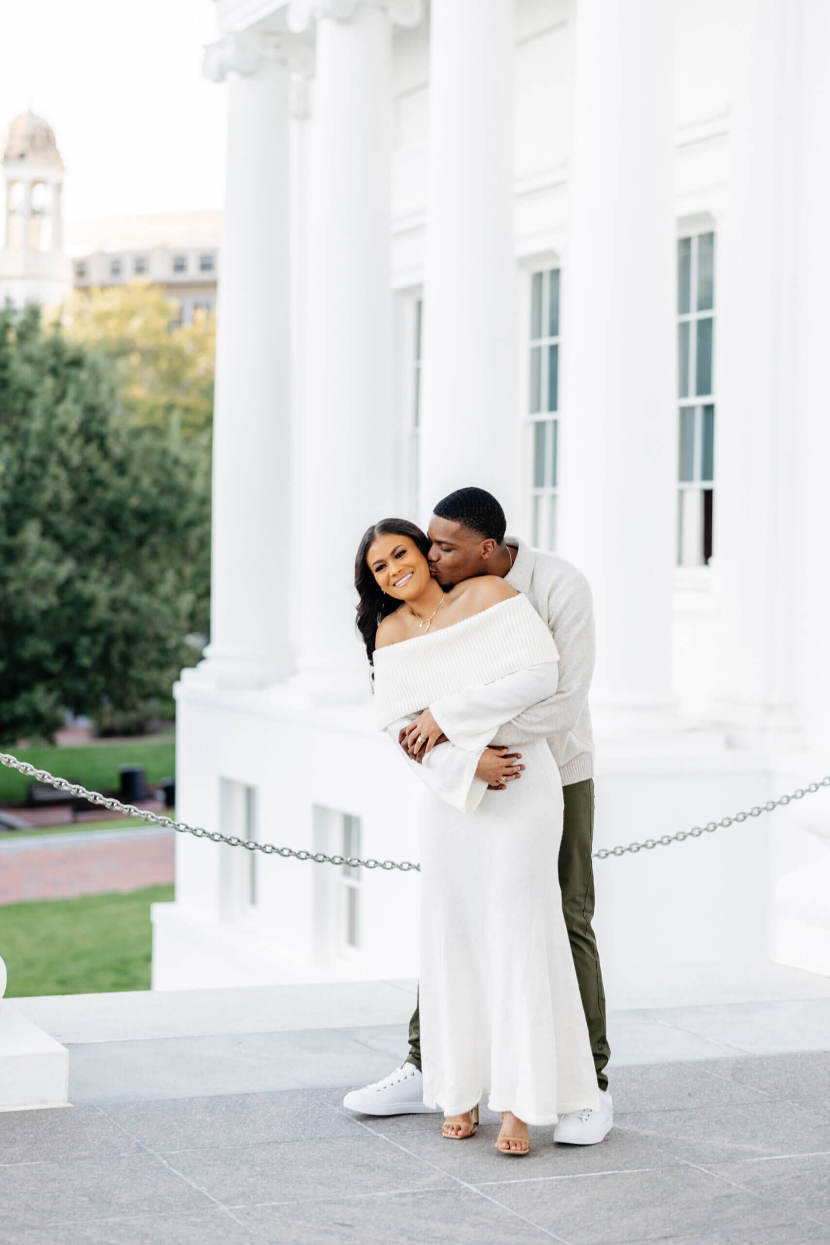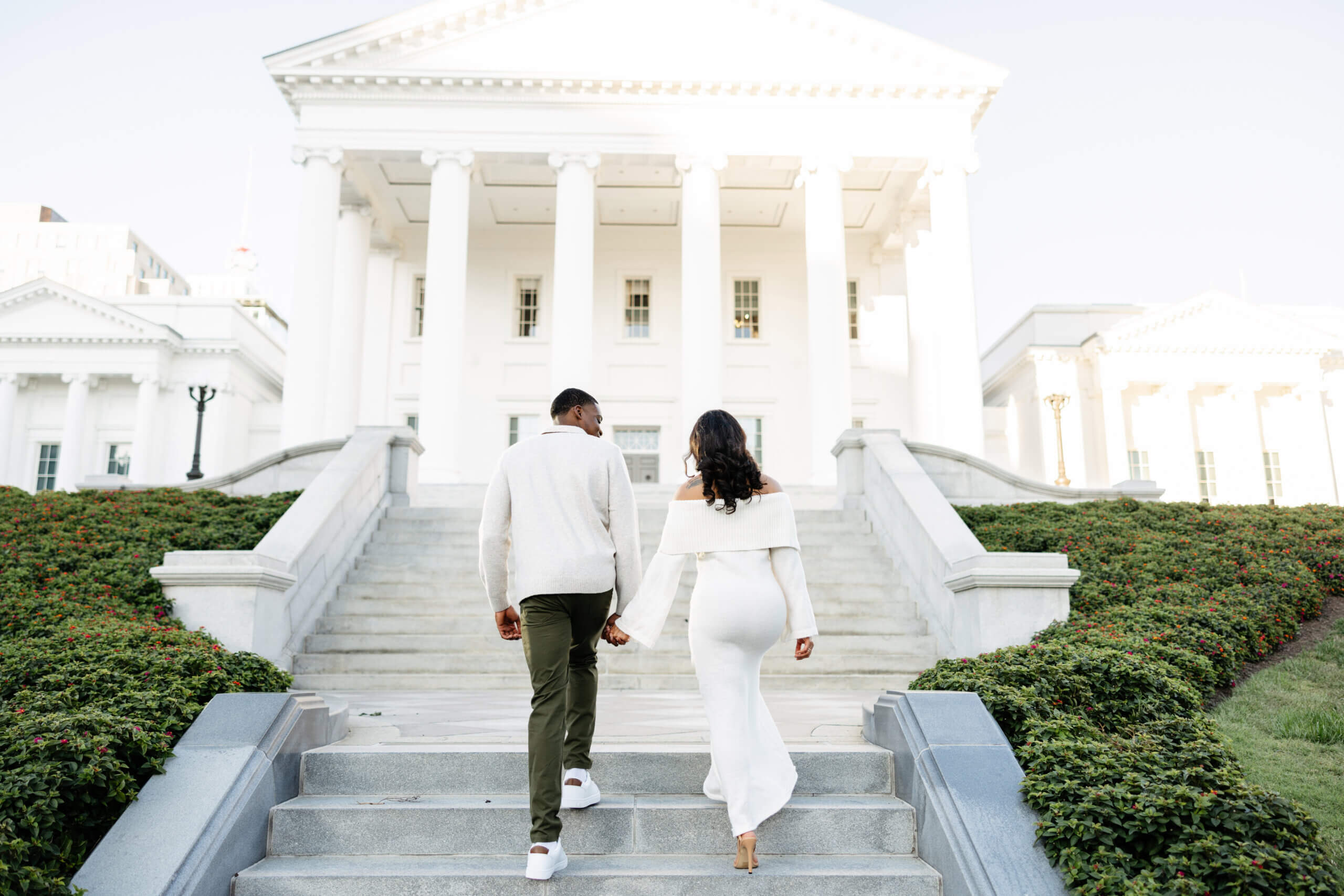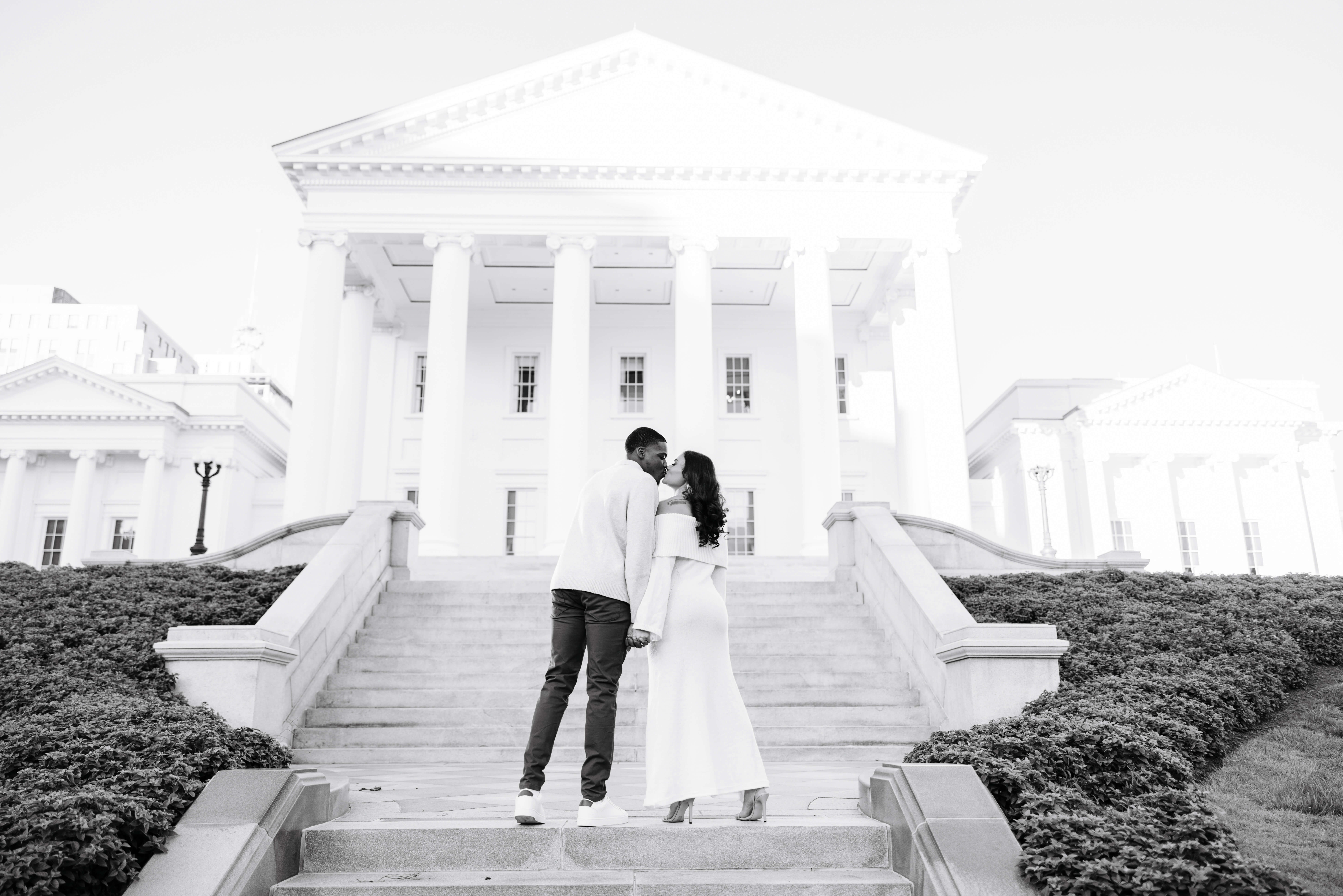 We always get excited when couples want photos here because this spot gives you a little bit of everything. The pathways, columns, and clean architecture photograph so well and add a timeless look. Additionally, the green spaces around the building bring in soft textures that balance everything out. When we plan Virginia Capitol Fall Engagement Photography, the space feels even more intentional. The leaves add warm color, and the cooler air makes the whole session feel relaxed!