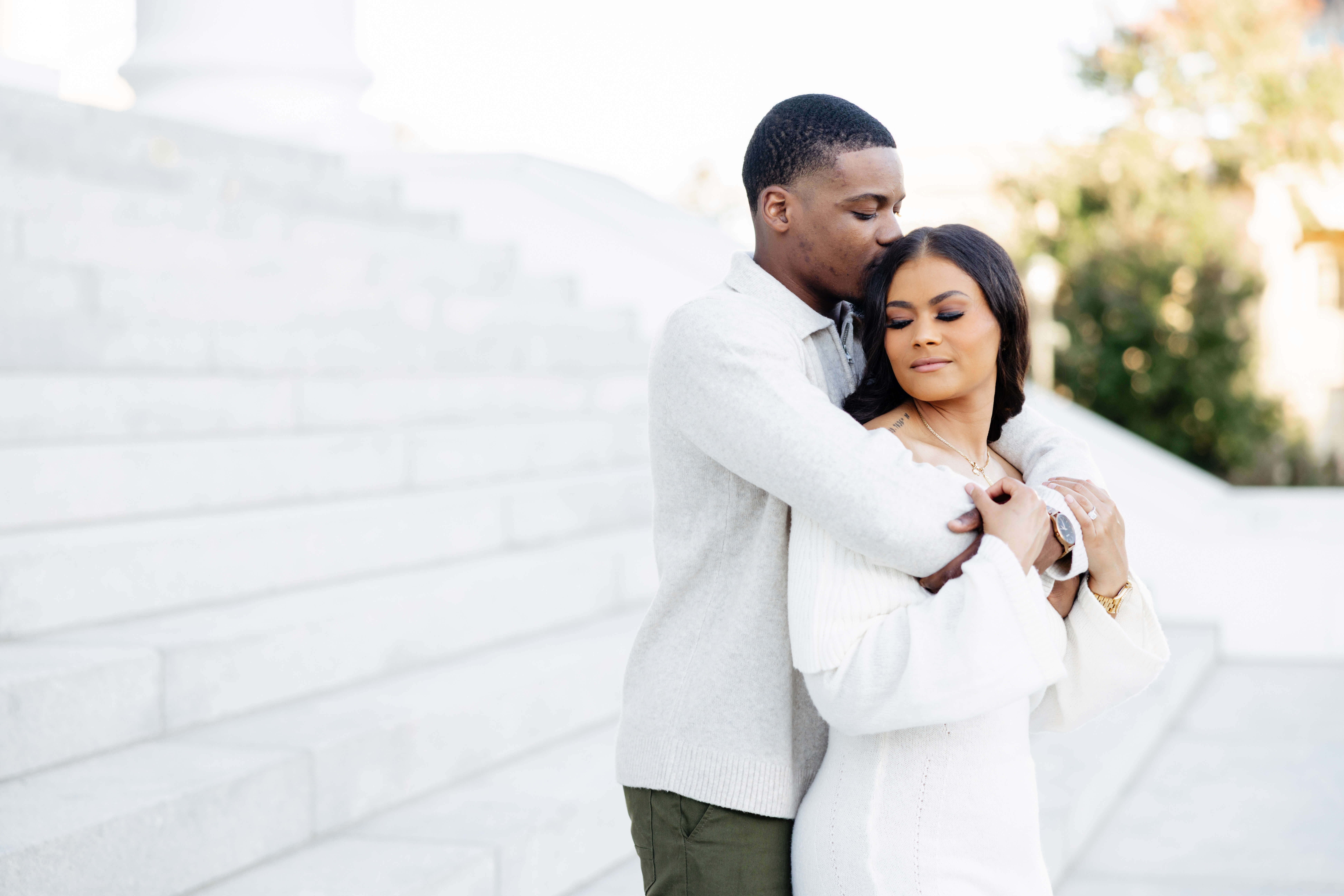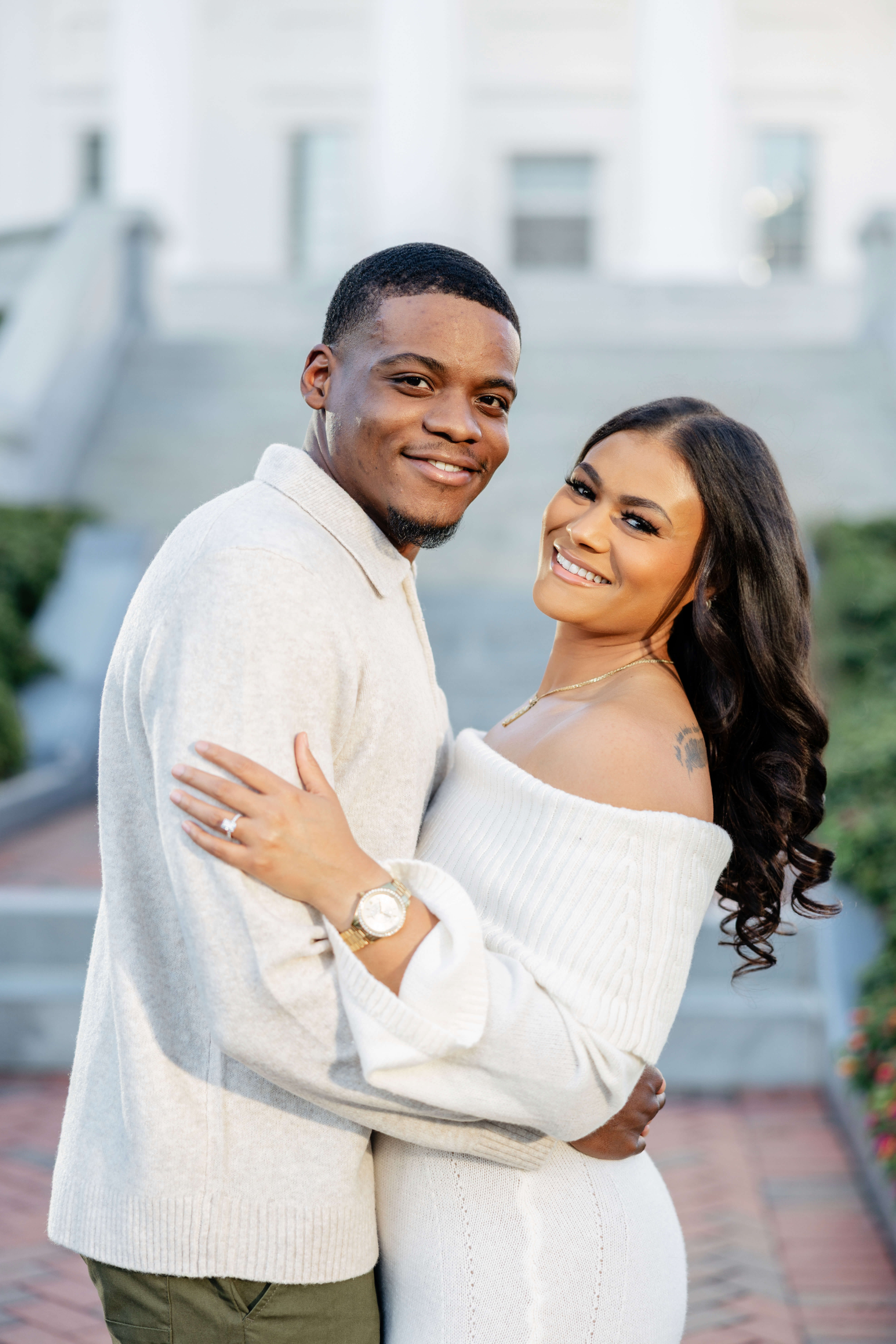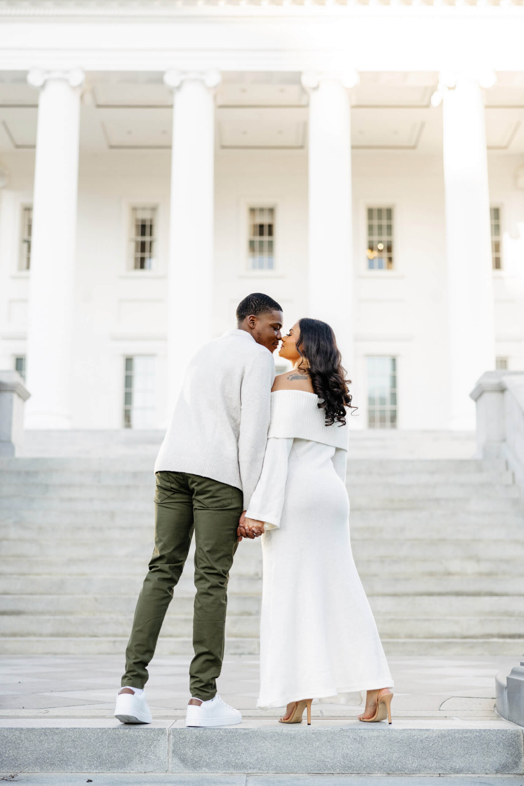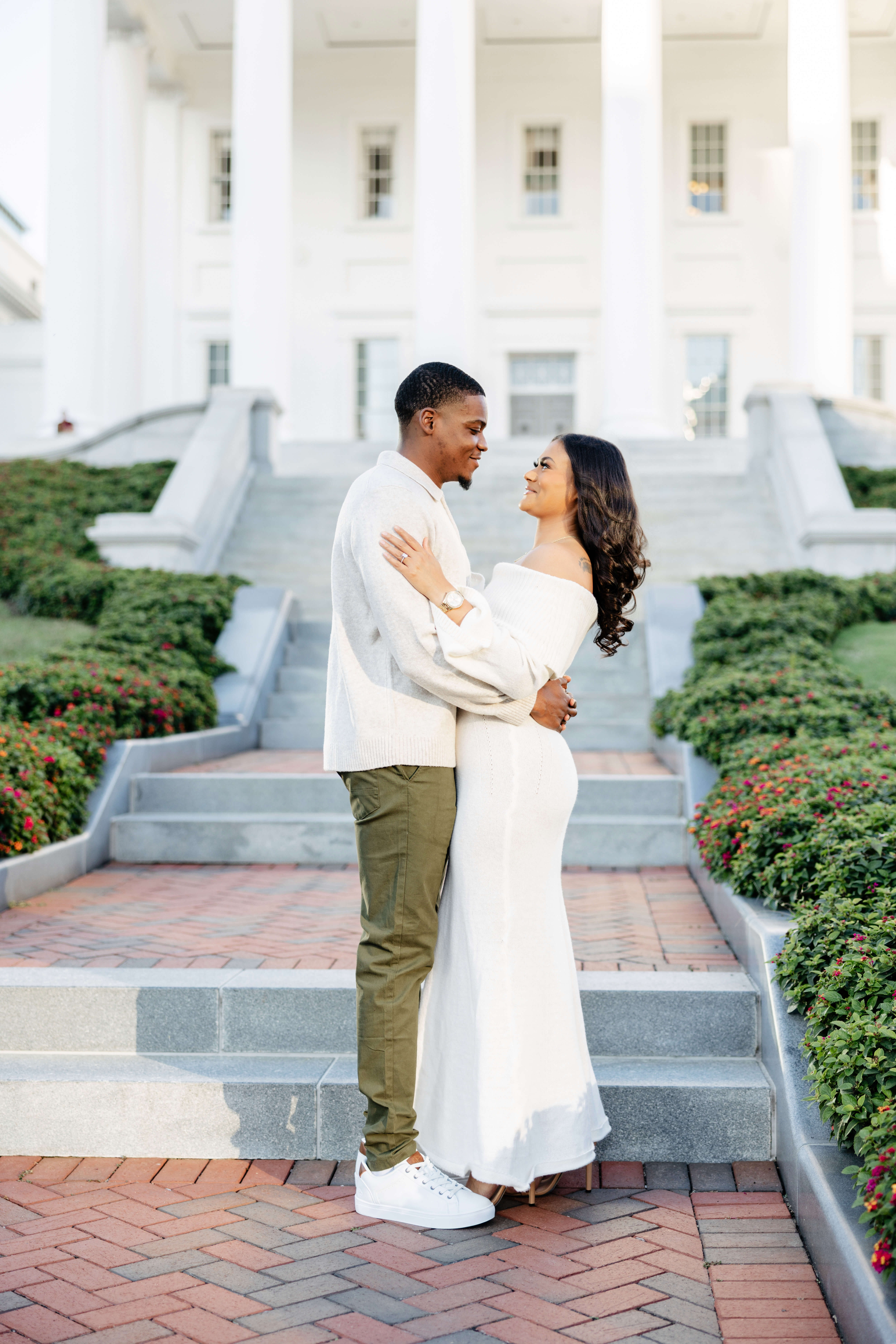 We always get excited when couples want photos here because this spot gives you a little bit of everything. The pathways, columns, and clean architecture photograph so well and add a timeless look. Additionally, the green spaces around the building bring in soft textures that balance everything out. When we plan Virginia Capitol Fall Engagement Photography, the space feels even more intentional. The leaves add warm color, and the cooler air makes the whole session feel relaxed!